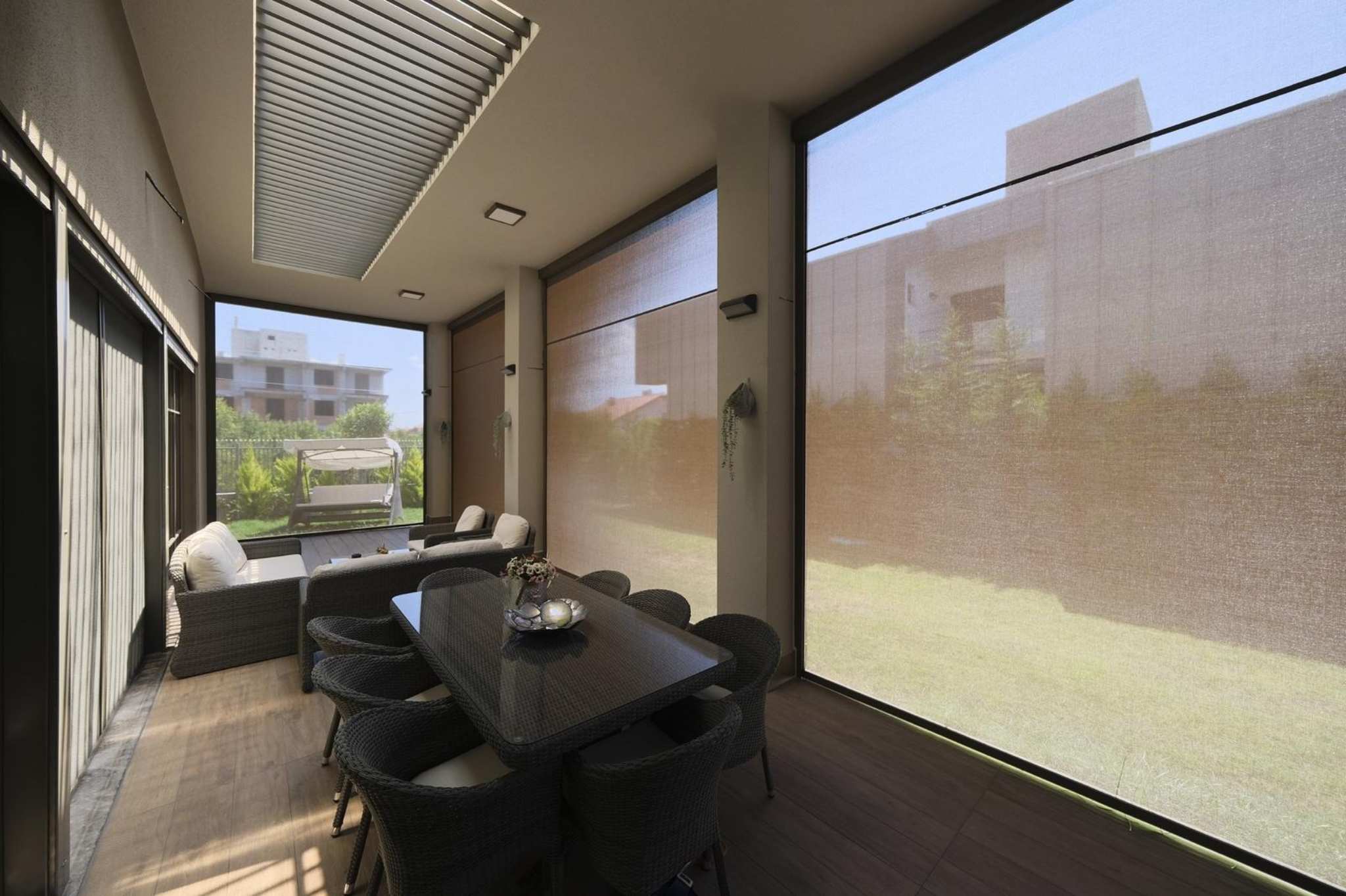 Überdachte Terrasse mit seitlichen Sonnenschutzrollos und Essbereich