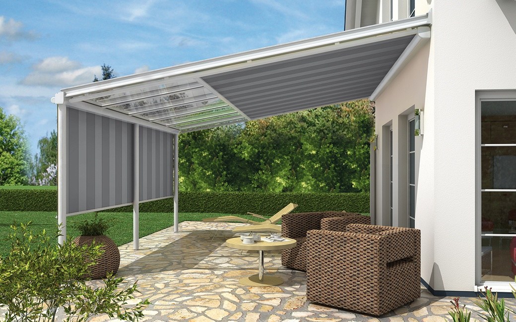 Terrassenüberdachung mit Glasschiebetüren und seitlichem Sonnenschutz-Screen in modernem Design