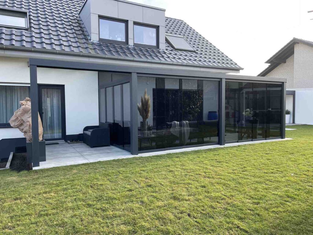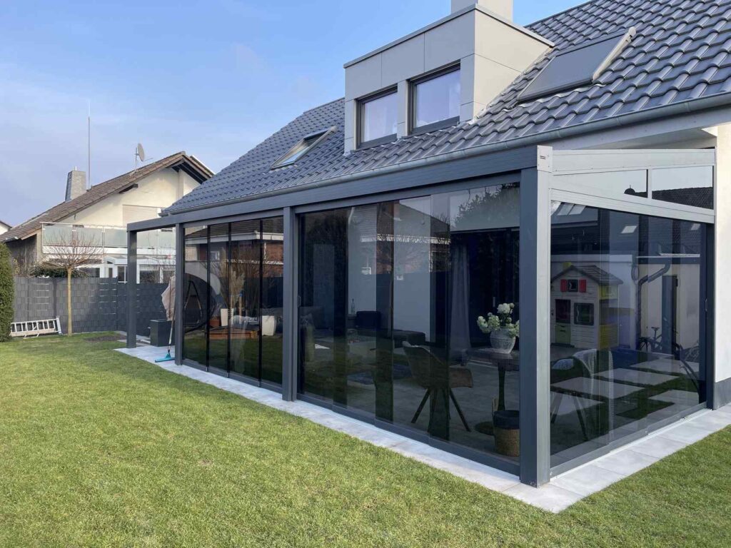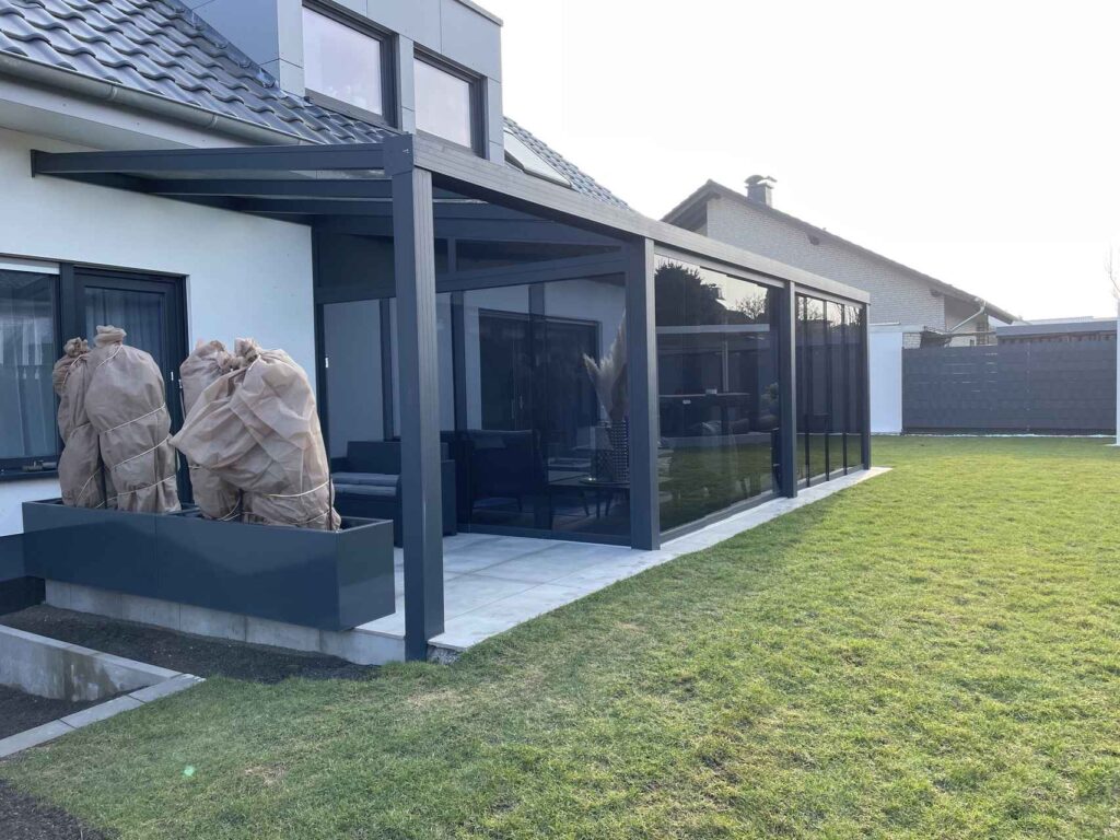 Mit einer Gesamtgröße von 8 x 3 Metern bietet die hochwertige Aluminium-Konstruktion ausreichend Platz für verschiedene Nutzungsbereiche und fügt sich harmonisch an die Hausfassade an.