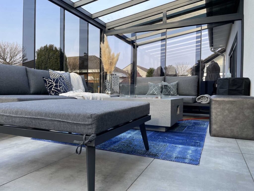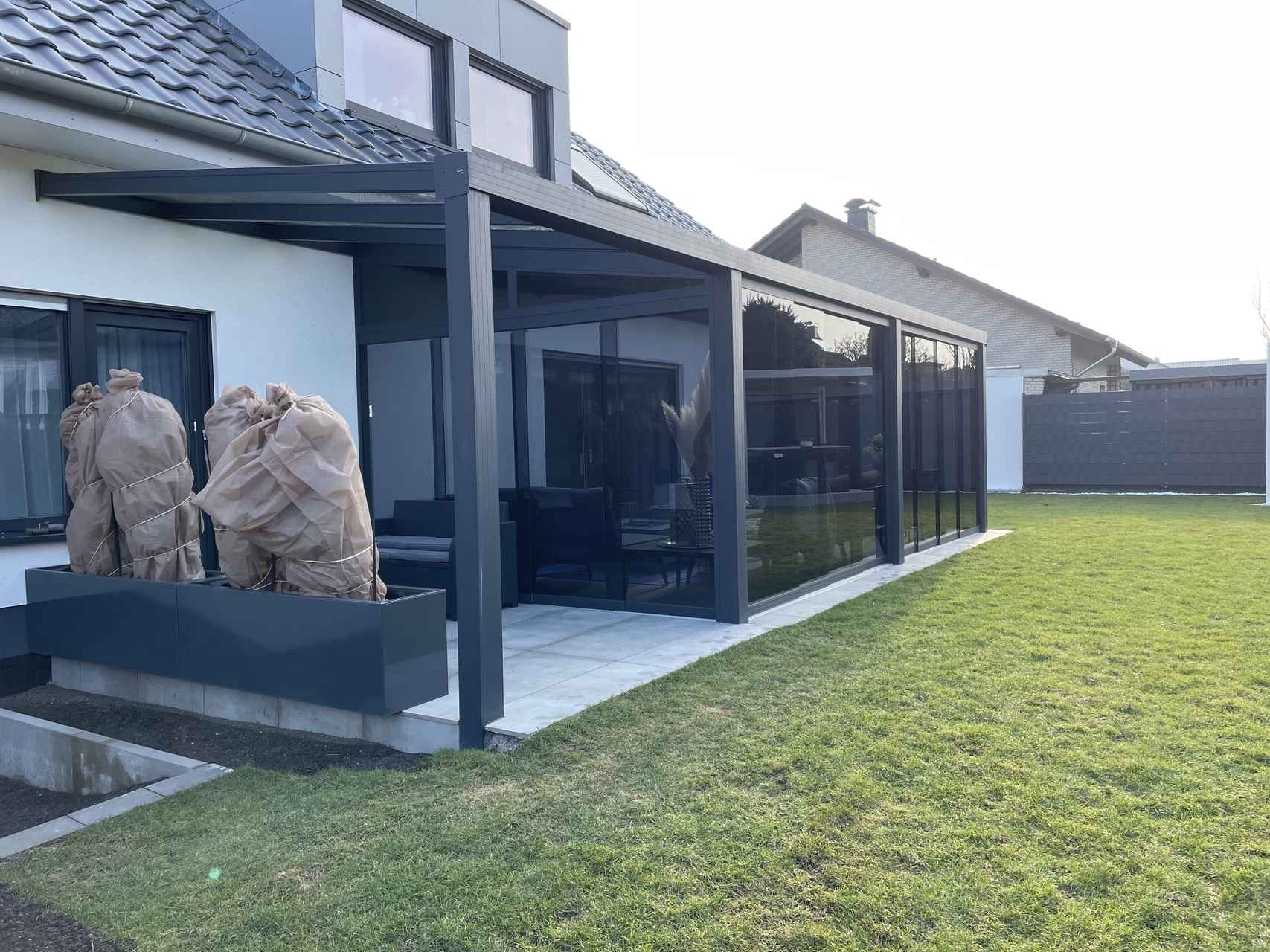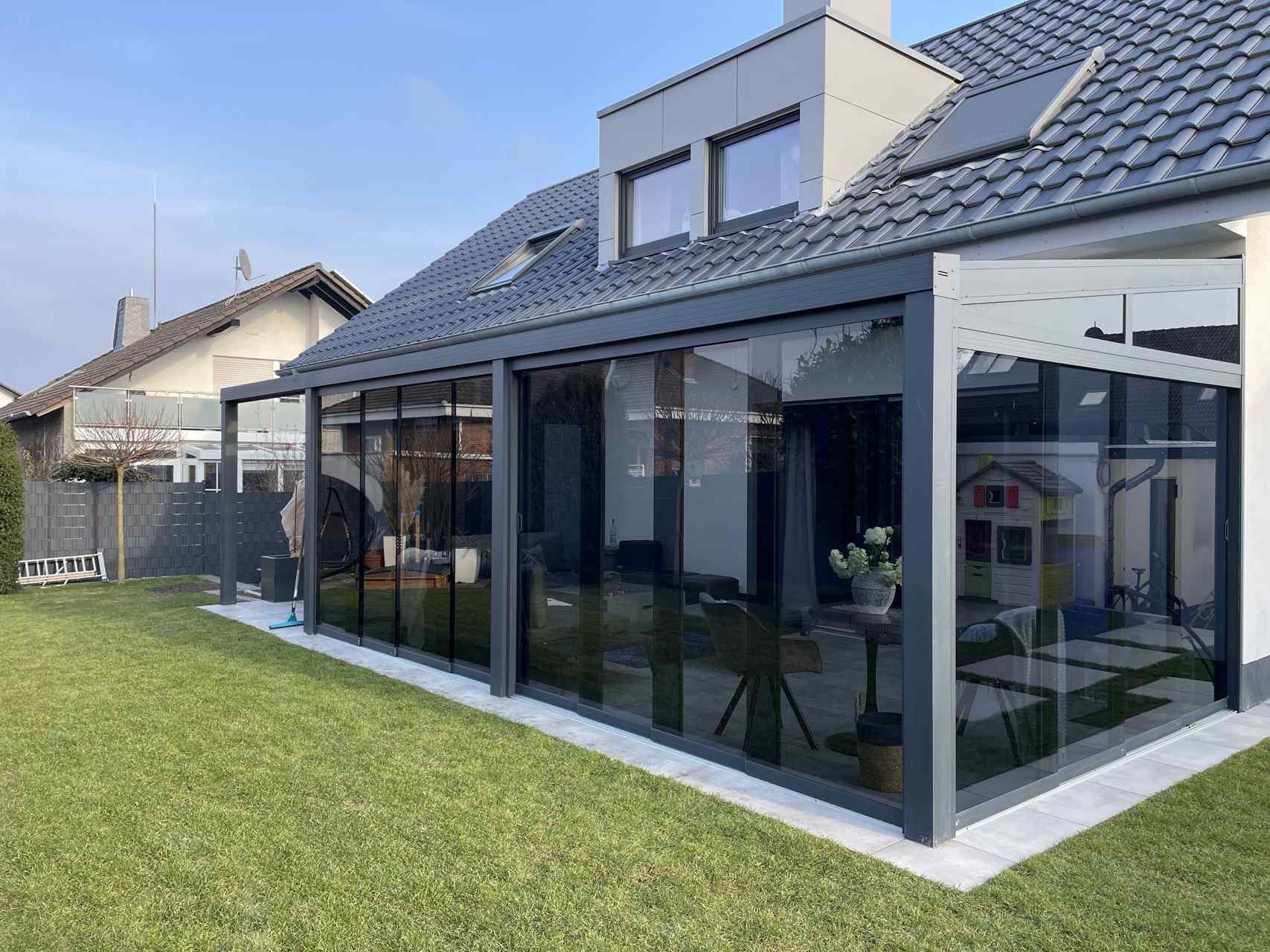 Terrassenüberdachung mit getönten Glasschiebewänden