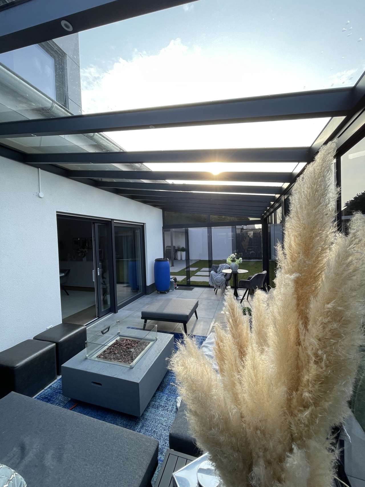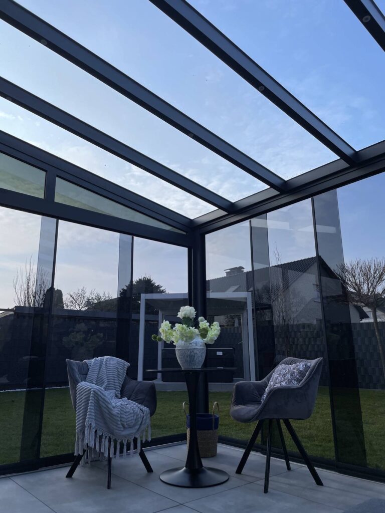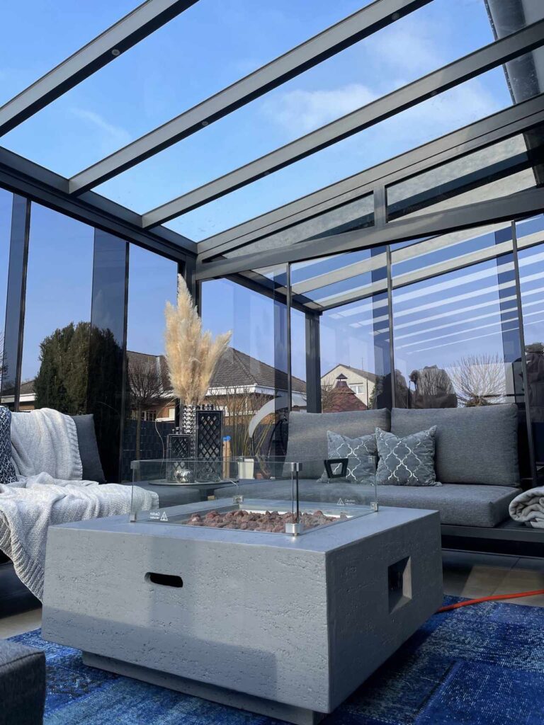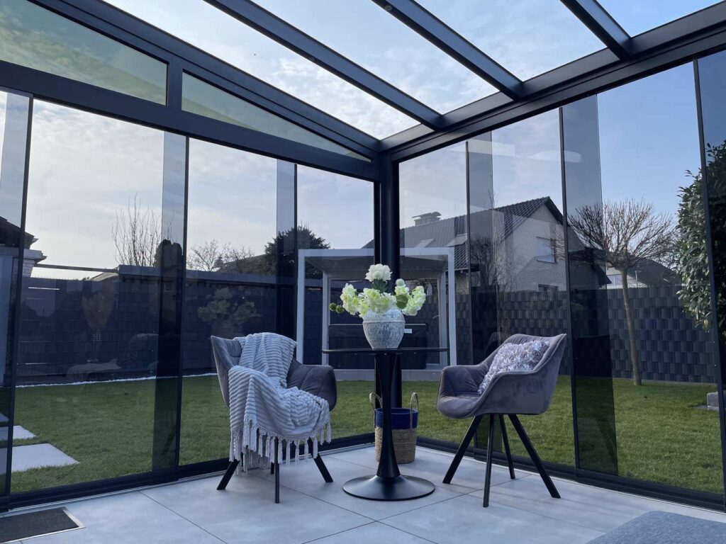 Terrassenüberdachung mit getönten Glasschiebewänden