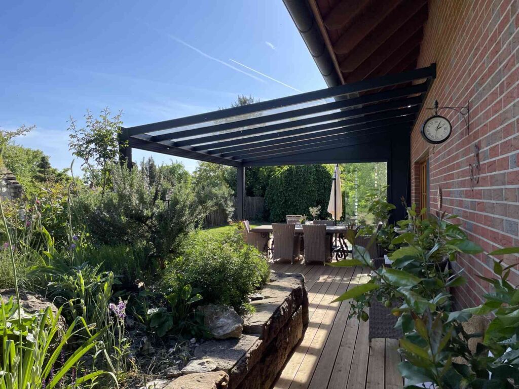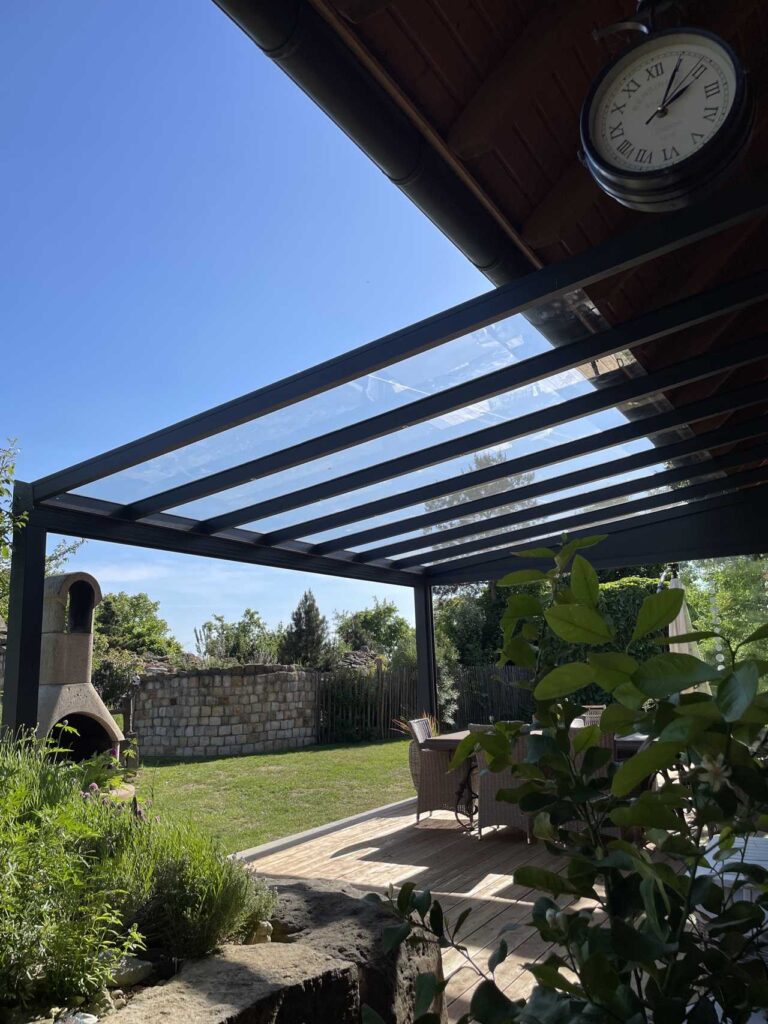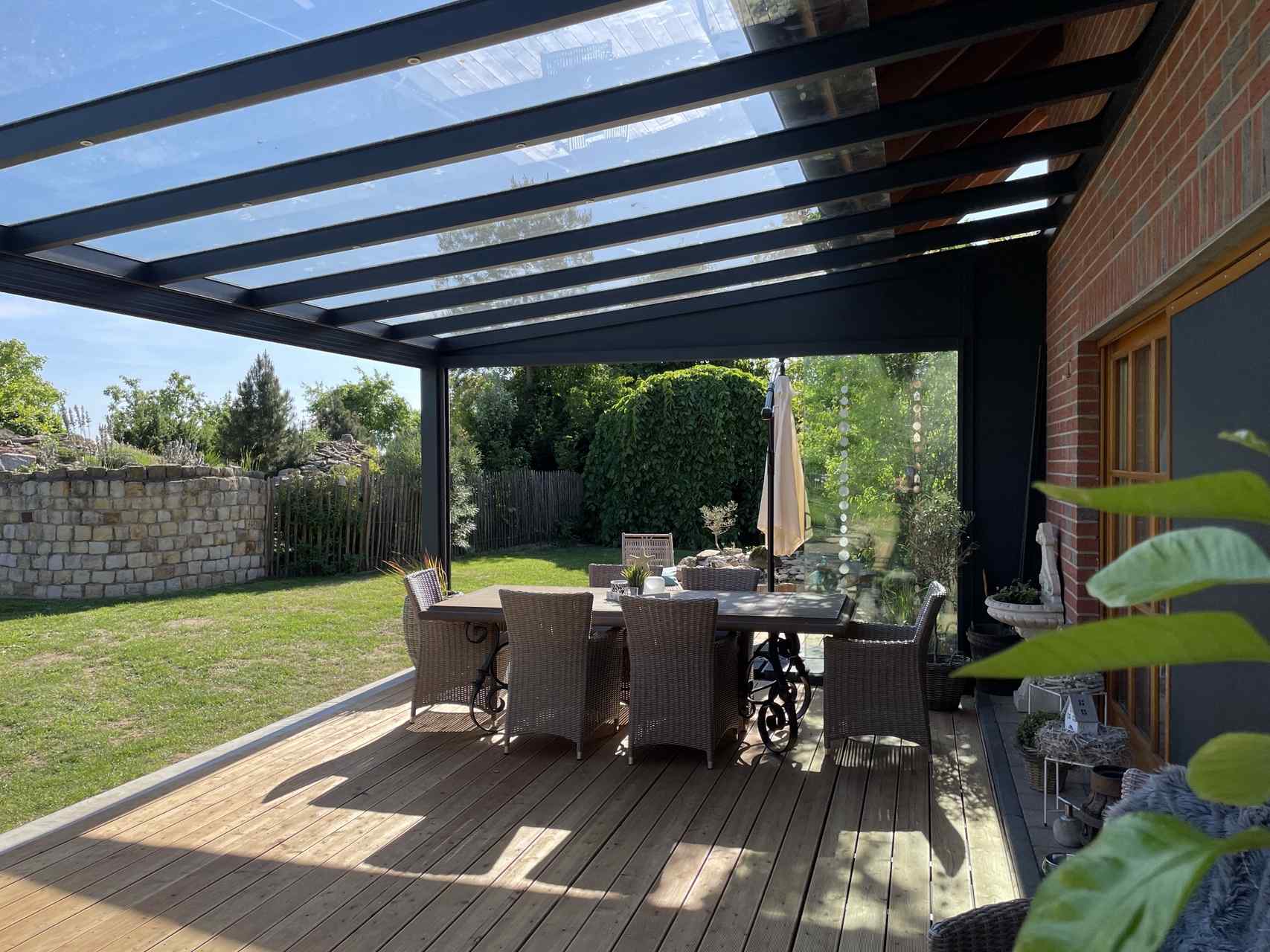 Das Glasdach sorgt für einen lichtdurchfluteten Außenbereich und bietet zuverlässigen Schutz vor Witterungseinflüssen.
