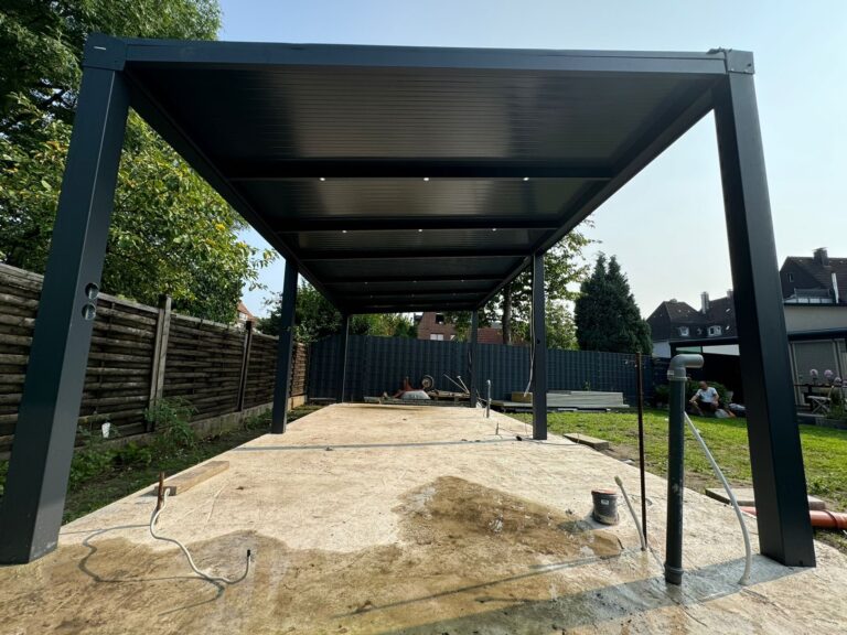 Ab jetzt genießt unser Kunde aus Delbrück im Kreis Paderborn die Freiheit und Offenheit einer maßangefertigten freistehenden Terrassenüberdachung. Unsere hochwertige Konstruktion aus anthrazitfarbenem Aluminium hat ein Lamellendach aus seidenmatt glänzendem Aluminium.